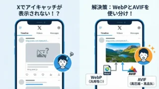 ブログ画像をWebPやAVIFにしたらXでアイキャッチが表示されない!その原因と対策を解説します。「アイキャッチはWebP、本文はAVIF」という使い分けが最強の理由とは?WordPressでの設定方法と、ブラウザ完結の自作無料変換ツールも紹介。