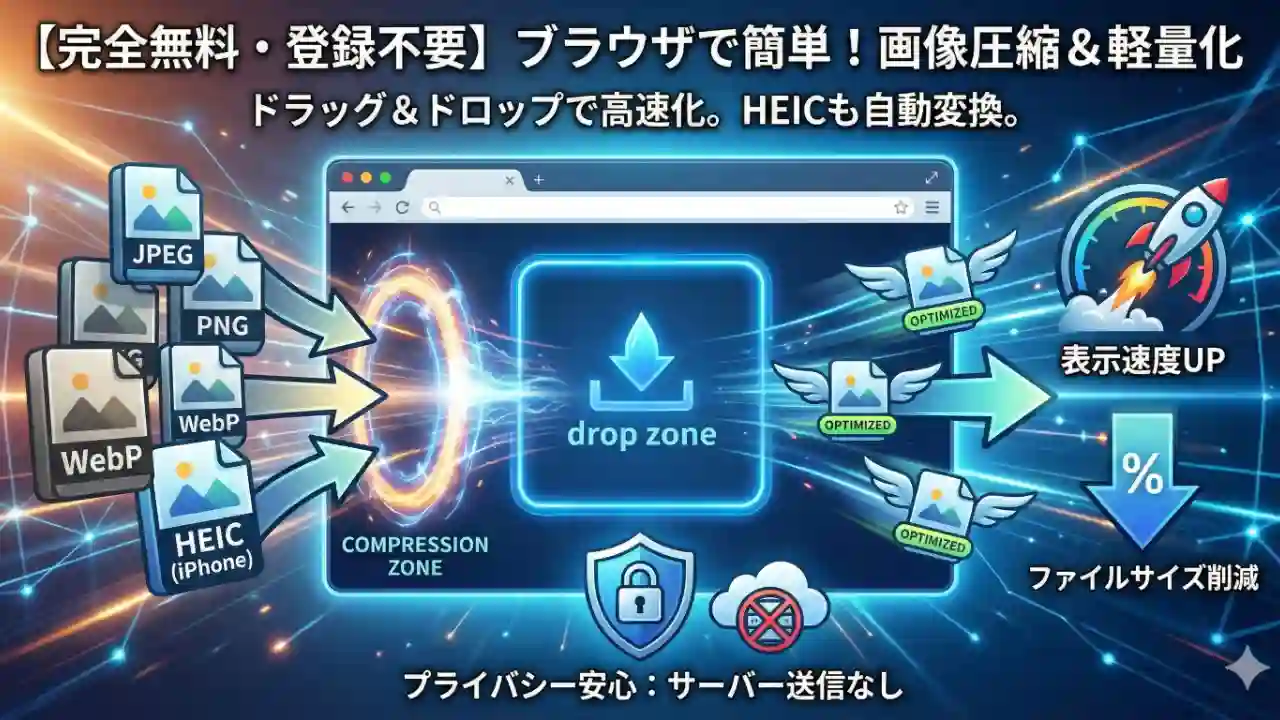 - このツールは圧縮専用です。画像のリサイズ(縦横サイズ変更)は行いません。