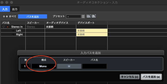 - 「バスを追加」をクリックし、構成を「Mono(モノラル)」にして追加する。